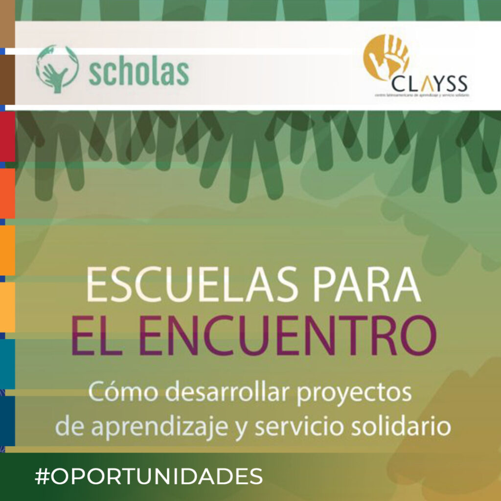 “Escuelas para el encuentro. Cómo desarrollar proyectos de aprendizaje-servicio solidario.” Segunda edición revisada, de María Nieves Tapia. Este texto es una versión actualizada de la primera edición de “Escuelas para el Encuentro”, publicada en 2017, en colaboración entre CLAYSS (Centro Latinoamericano de Aprendizaje y Servicio Solidario) y Scholas Occurentes. La segunda edición que aquí presentamos y fue compartida en el marco de la XXII Semana Internacional del Aprendizaje y Servicio Solidario en Buenos Aires, fue actualizada para su traducción al portugués gracias a la generosa iniciativa de la editorial brasilera FTD Educação, y en castellano, producida por CLAYSS con la colaboración de Scholas.
